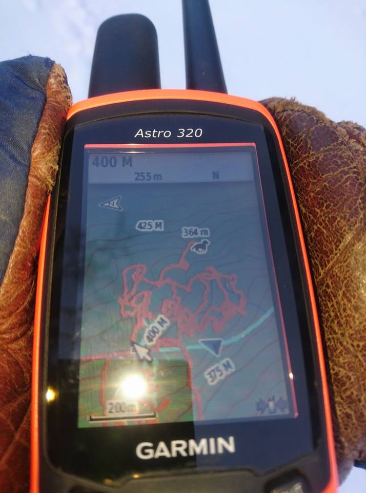 Sedan började även pejlen krångla lite, som man kan se på bilden så visar den att Kelly är dryga 400 meter bort, fast hon stod 5 meter från mig. Har gjort en uppdatering på halsbandet, så får vi se vid nästa släpp om det funkat bättre. Siktar på att släppa igen i morgon, sedan ser det ut att komma mer snö och varmare väder.